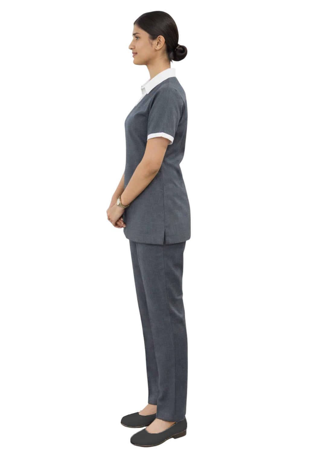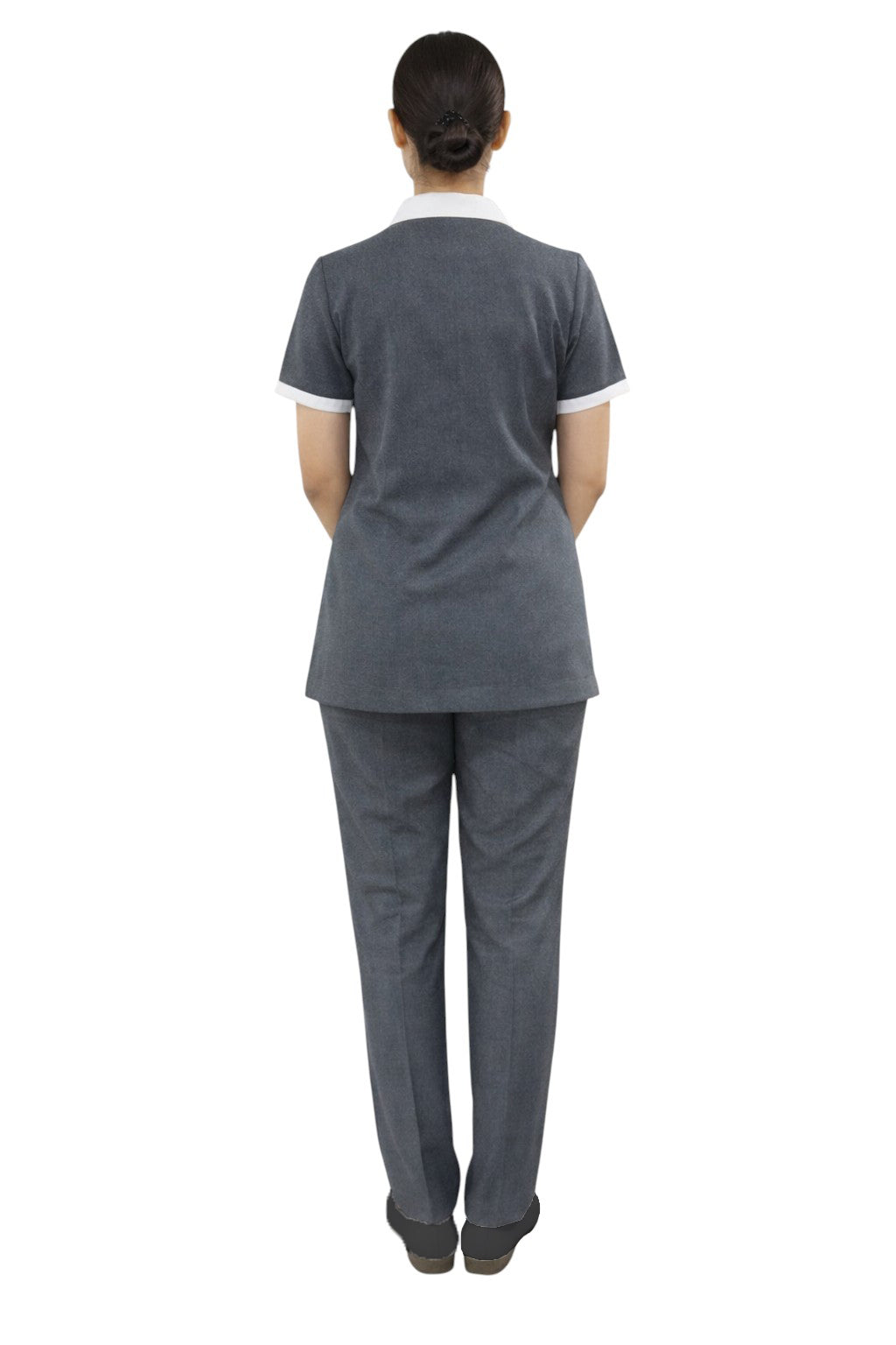 •Executive Professional Design – Elegant Grey top with contrast white collar paired with matching trouser for a sharp corporate appearance.
